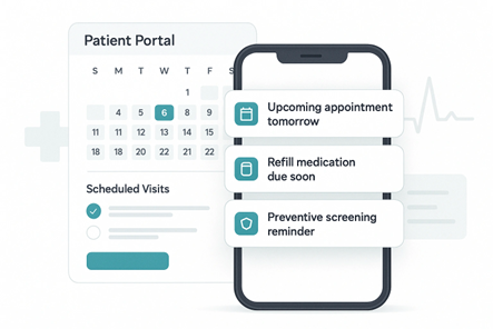 Engagement drops when patients forget appointments or neglect follow-up care. Portals solve this by automating reminders. Follow-up features seen in many patient portals for healthcare: